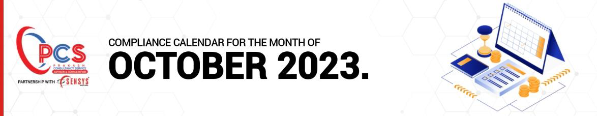 Appended below is the Pan India Compliance calendar for October 2023, the employer is under obligation to contribute towards some of the above-mentioned compliances for the welfare of the employees. Each of these compliances is again governed by a set of rules and formulas. It is proven to be a deliberate attempt to violate the provisions of the law, there could be imprisonment of the employer. Please, comply with the same in time to avoid any future non-compliance so that hefty penalties and fines are not charged by the respective dept.