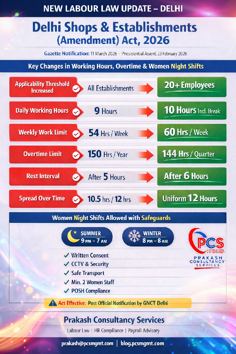 Employers operating in Delhi should review their HR policies, working hour structures, overtime practices, and workplace safety arrangements to ensure preparedness for compliance once the Act is brought into force through a formal commencement notification.